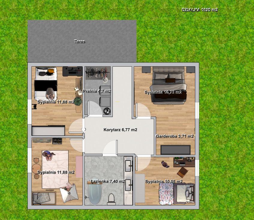 - cztery ustawne sypialnie: 11,88 m², 11,88 m², 10,05 m² oraz 14,44 m² (z możliwością wydzielenia garderoby),