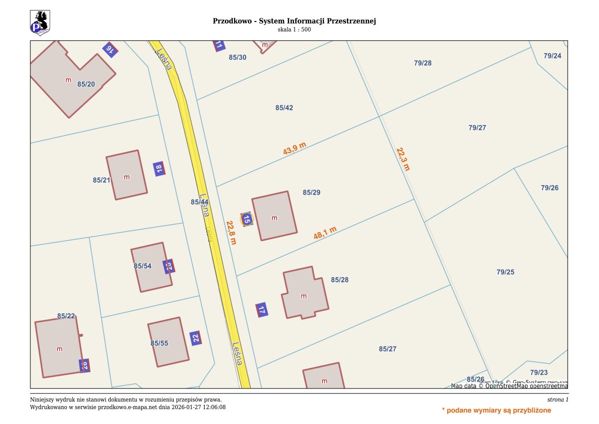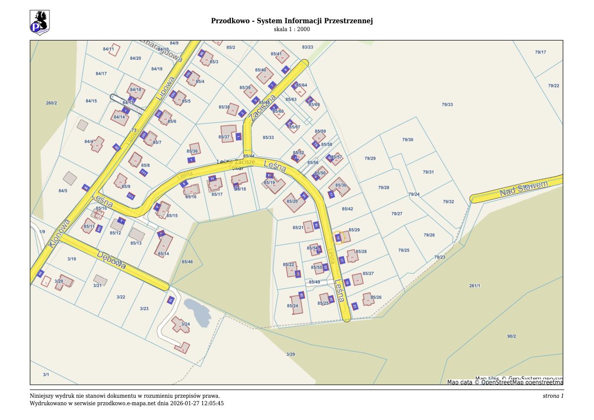 Nieruchomość znajduje się na działce o nr ewidencyjnym 85/29 o powierzchni 1025 m², w otoczeniu lasów i nowej zabudowy jednorodzinnej, co zapewnia prywatność oraz codzienny komfort.