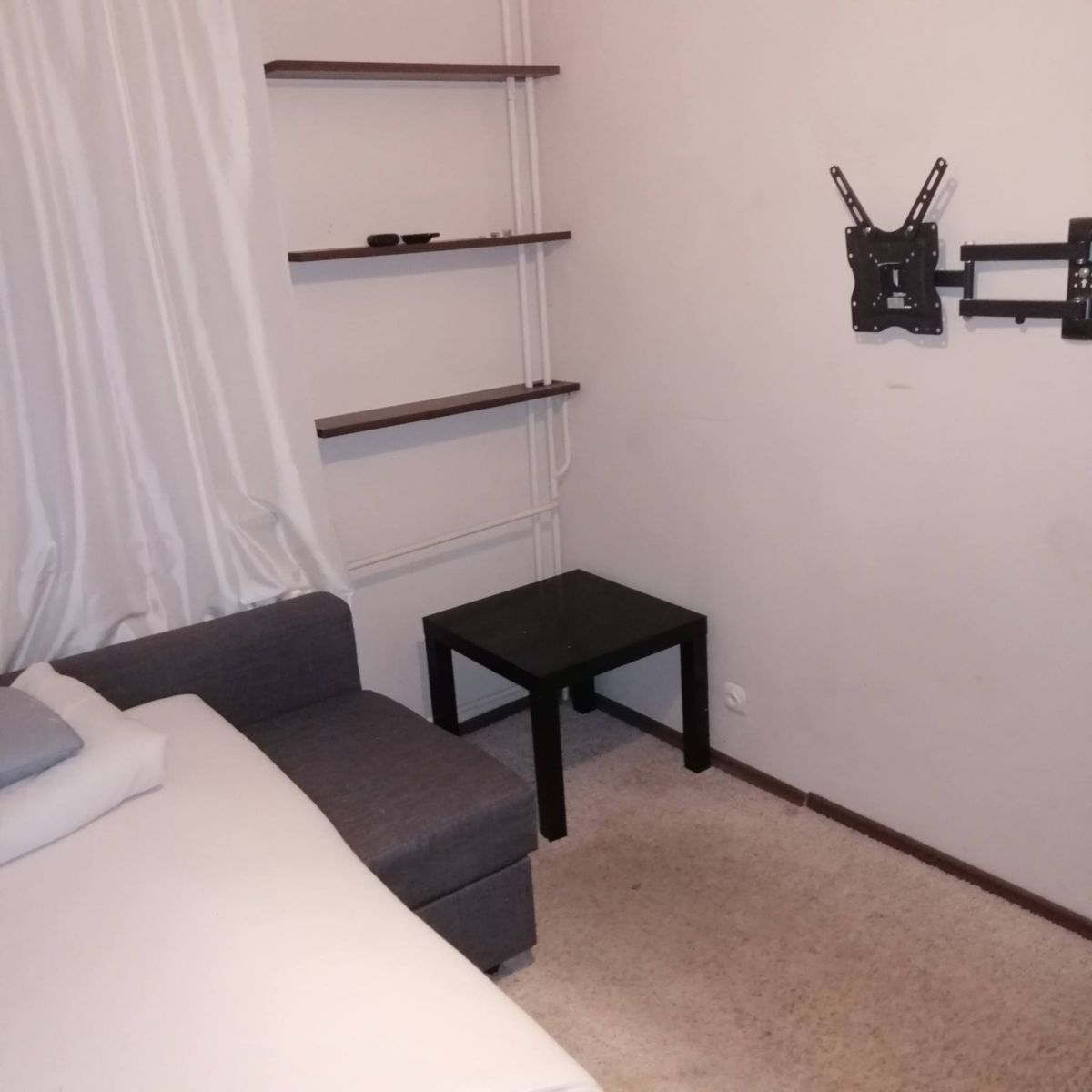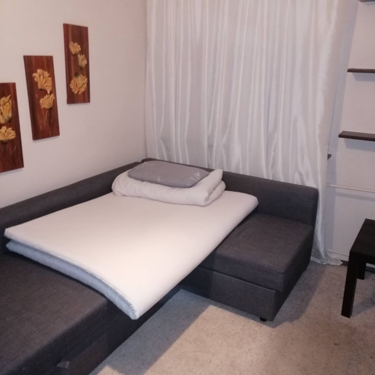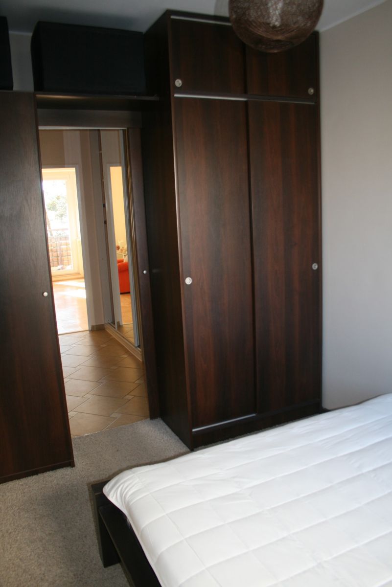 Wyposażenie: rozkładana kanapa, zabudowa na jednej ze ścian (dużo miejsca do przechowywania).