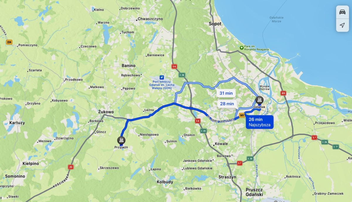 - pracujących w Gdańsku lub Gdyni - Twoja działka jest idealnie skomunikowana zarówno z Gdańskiem, Gdynią czy Sopotem. Obecnie w budowie jest trasa OMT (oddanie 2025/26), którym szybko dojedziesz do Gdańska (ok. 15 minut), węzeł będzie się łączył z już istniejącym Węzłem Chwaszczyno, którym równie szybko dojedziesz do Gdyni (ok. 15 minut). OMT będzie się łączył z Trasą Kaszubską a w przyszłości z via Maris prowadzącą bezpośrednio na Półwysep Helski. A może chcesz skorzystać z transportu publicznego? Oczywiście, możesz skorzystać z PKM (stacja Żukowo, Łapino, Stara Piła). A może autobus? Oczywiście - linia 806;